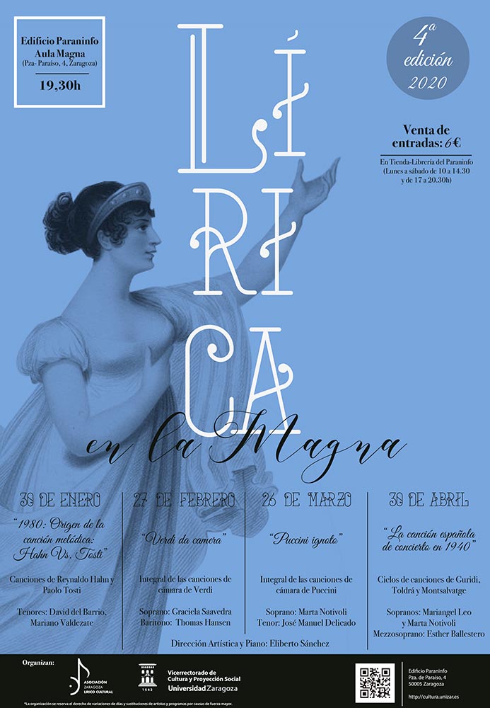 El IV Ciclo “Lírica en la Magna” pretende acercar la Lírica al gran público y, al mismo tiempo, contar con el ya iniciado o especializado. Esta edición tiene como eje temático el género de la canción de cámara. Así de este modo, realizaremos un recorrido por cuatro de sus diferentes corrientes y estilos dentro de la historia de la Lírica.